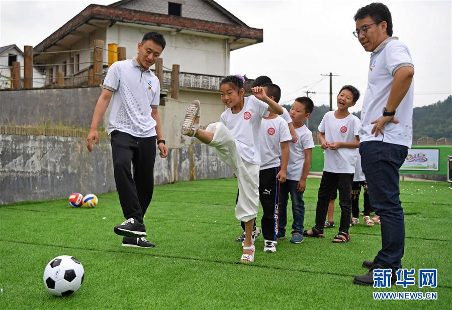 5月27日,在江西省貴溪市金屯鎮(zhèn)金屯村渡坊村小組,志愿者和留守兒童一起進(jìn)行體育活動(dòng)。