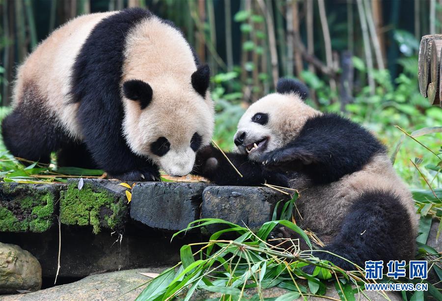 5月27日,大熊貓隆仔(左)突然出手,搶走婷仔的竹子。正在享受竹子大餐的廣州長隆野生動物世界大熊貓婷仔被大熊貓隆仔搶食,兩只大熊貓上演一場爭食戲碼。新華社記者劉大偉攝