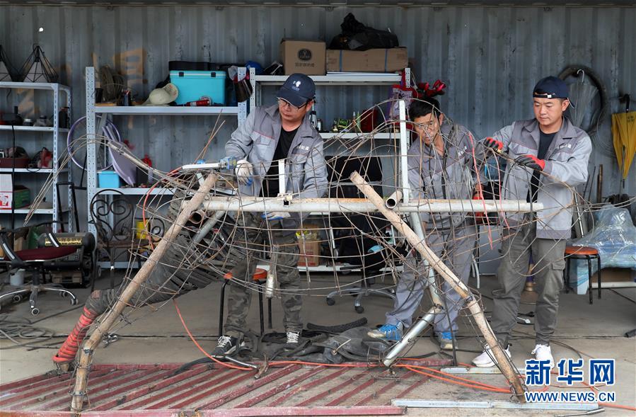 5月27日,制作團(tuán)隊成員郭宇(左)、劉景強(qiáng)(中)和李剛在中轉(zhuǎn)服務(wù)站工棚內(nèi)工作。新華社記者方喆攝