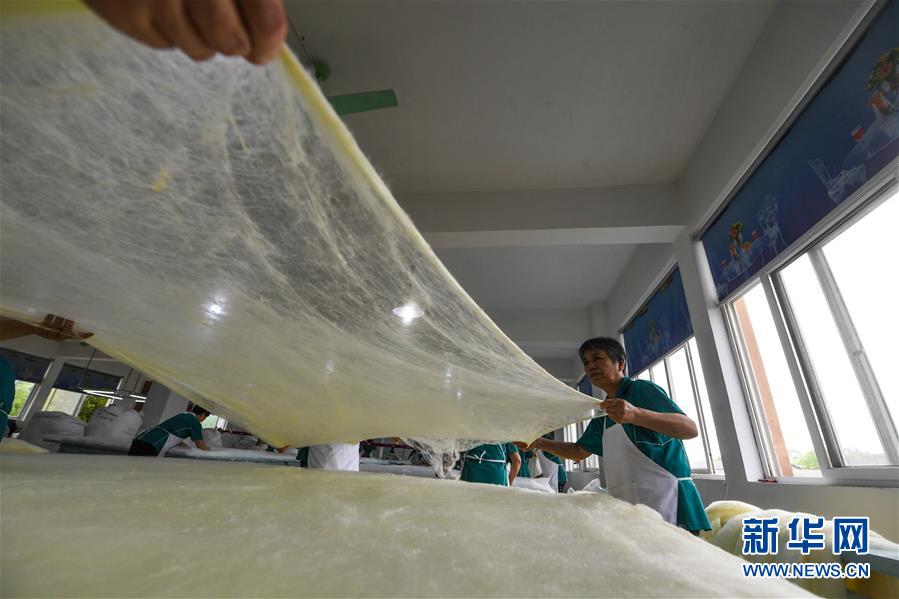5月27日,在位于桐鄉(xiāng)市洲泉鎮(zhèn)的浙江蠶緣家紡股份有限公司內(nèi),工作人員把加工好的黃金蠶絲進行“拉絲綿”工序,準備用于制作蠶絲被。新華社記者徐昱攝