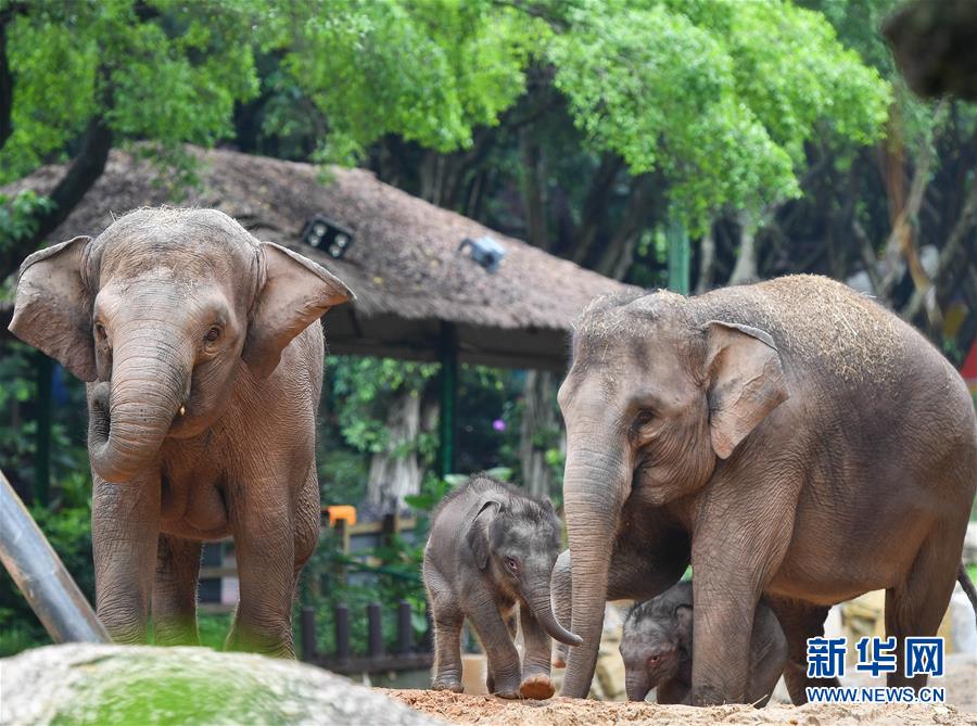 5月27日,廣州長隆的兩只新生亞洲象寶寶在媽媽的陪伴下玩耍。新華社記者劉大偉攝
