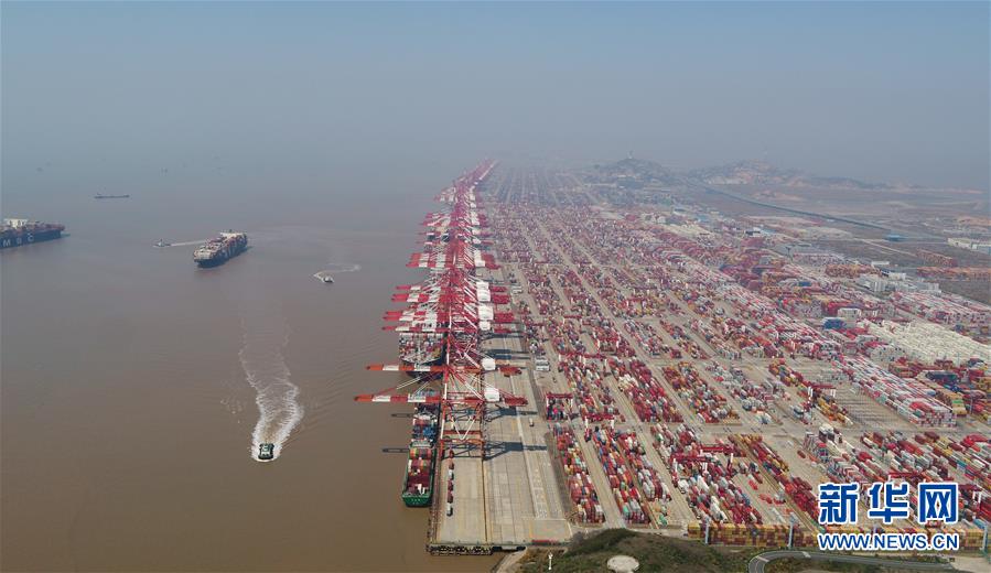 這是3月18日拍攝的上海洋山港集裝箱碼頭(無人機照片)。新華社記者丁汀攝
