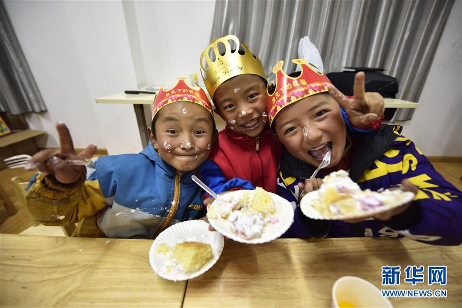 5月27日,玉麥鄉(xiāng)小學(xué)的孩子們一起唱生日歌。新華社記者王炳坤攝