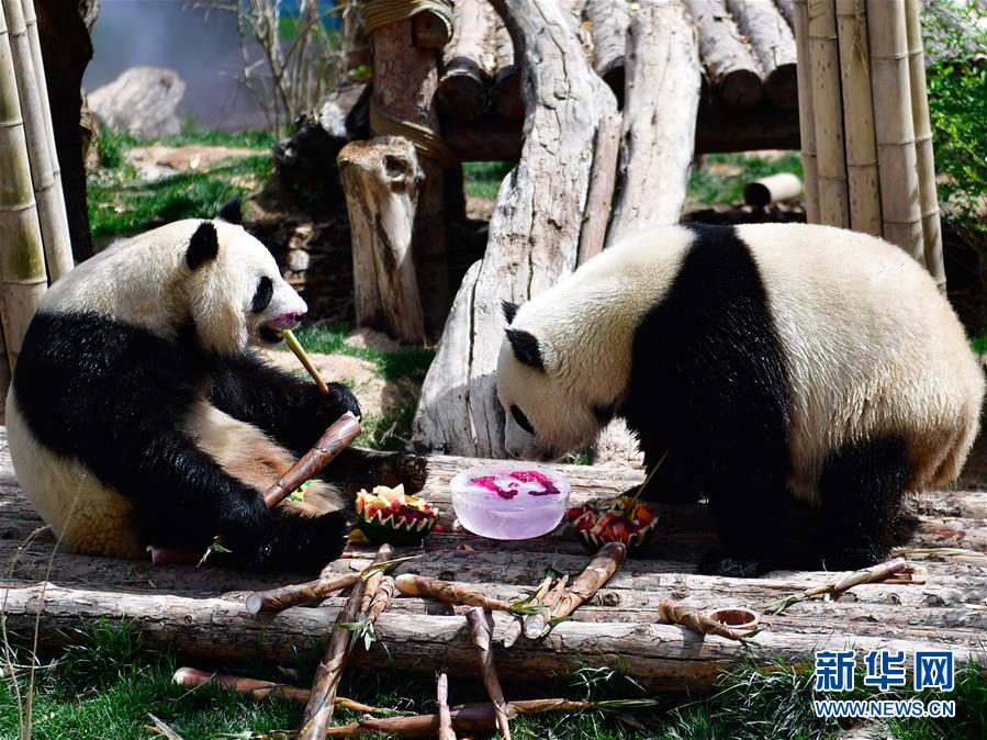 5月31日,兩只大熊貓在享用兒童節(jié)“大餐”。新華社記者張龍攝