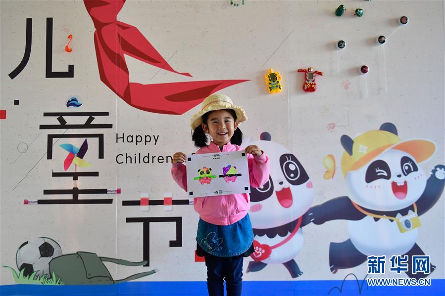 5月31日,一位小朋友在西寧熊貓館內展示自己的熊貓主題畫作。新華社記者張龍攝