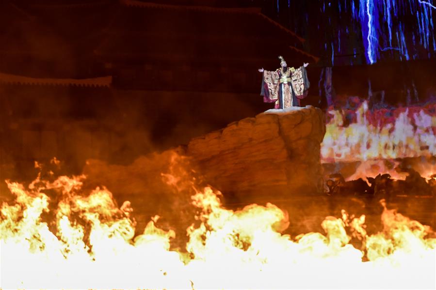 5月28日,演員在大型實景神話音樂劇《昆侖之約》中表演。5月28日,新疆文化旅游新名片——大型實景神話音樂劇《昆侖之約》在烏魯木齊南山景區(qū)上演。該劇融自然山水之美、藝術文化之光、現代科技之新于一體,為市民獻上一場視聽盛宴。新華社記者丁磊攝。