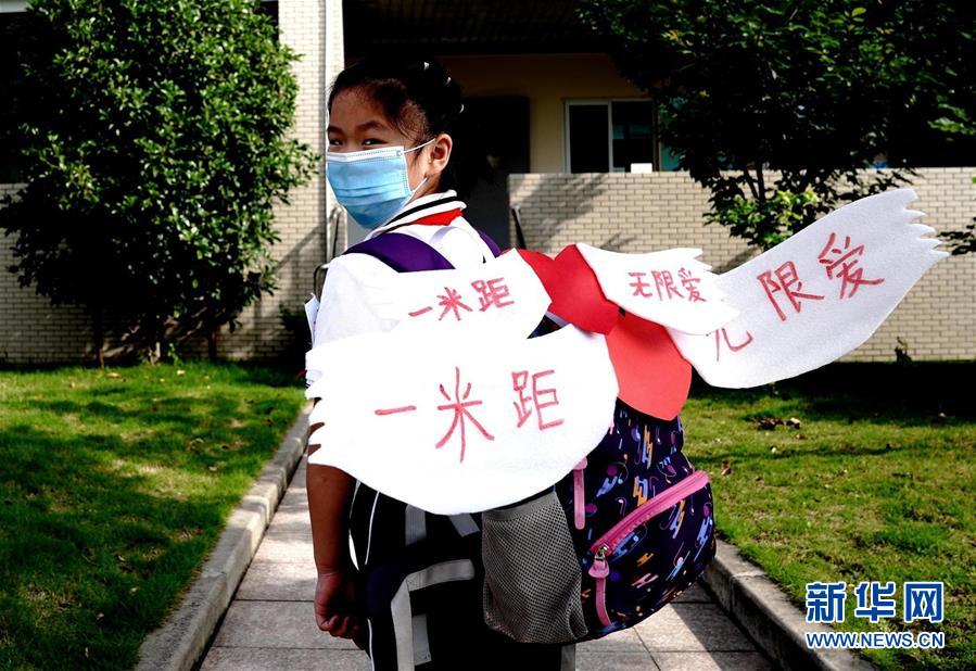 6月2日,上海閔行區(qū)鑫都小學(xué),一名小學(xué)生戴著“一米翅膀”走在校園里。當(dāng)日,上海小學(xué)一、二、三年級(jí)學(xué)生返校開(kāi)學(xué)。新華社記者張建松攝