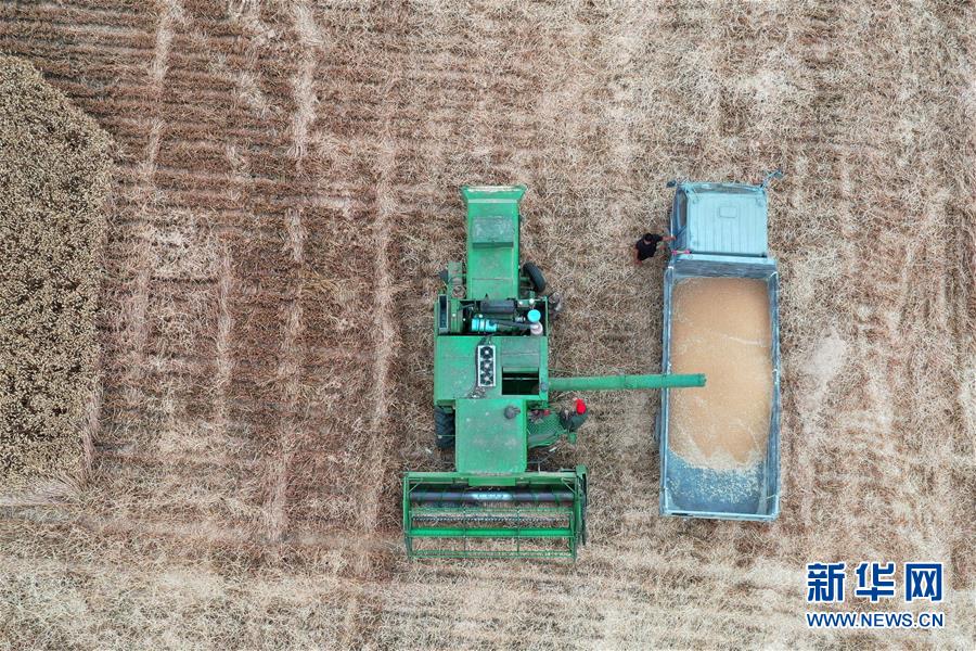 6月2日,在河南省黃泛區(qū)農(nóng)場九分場的麥田里,農(nóng)民操作大型收割機(jī)收獲小麥(無人機(jī)照片)。新華社記者馮大鵬攝。