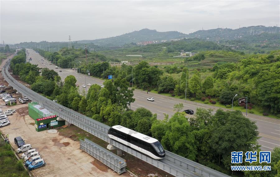 6月3日,一臺(tái)“云巴”在專用運(yùn)行軌道上進(jìn)行調(diào)試(無(wú)人機(jī)照片)。近日,重慶市首條“云巴”示范線項(xiàng)目在重慶璧山區(qū)正式亮相。此次發(fā)布的“云巴”采用電能驅(qū)動(dòng),具有轉(zhuǎn)彎半徑小、爬坡能力強(qiáng)、噪音低、安全性高、建設(shè)成本低、建造周期短等優(yōu)勢(shì),能為乘客提供更智能、舒適、便捷的出行體驗(yàn)。據(jù)介紹,璧山區(qū)“云巴”示范線項(xiàng)目自2019年8月開(kāi)建,線路正線全長(zhǎng)15.4km,共設(shè)車站15座,預(yù)計(jì)2020年9月全線通車。新華社記者劉潺攝。