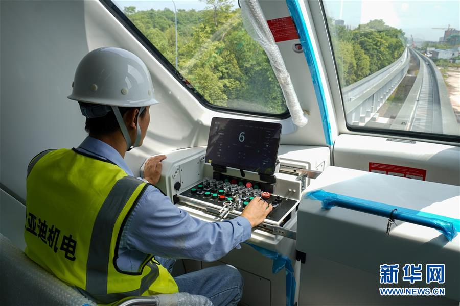 6月3日,工程技術(shù)人員在“云巴”車廂內(nèi)對自動駕駛系統(tǒng)進行調(diào)試。近日,重慶市首條“云巴”示范線項目在重慶璧山區(qū)正式亮相。此次發(fā)布的“云巴”采用電能驅(qū)動,具有轉(zhuǎn)彎半徑小、爬坡能力強、噪音低、安全性高、建設(shè)成本低、建造周期短等優(yōu)勢,能為乘客提供更智能、舒適、便捷的出行體驗。據(jù)介紹,璧山區(qū)“云巴”示范線項目自2019年8月開建,線路正線全長15.4km,共設(shè)車站15座,預計2020年9月全線通車。新華社記者劉潺攝。