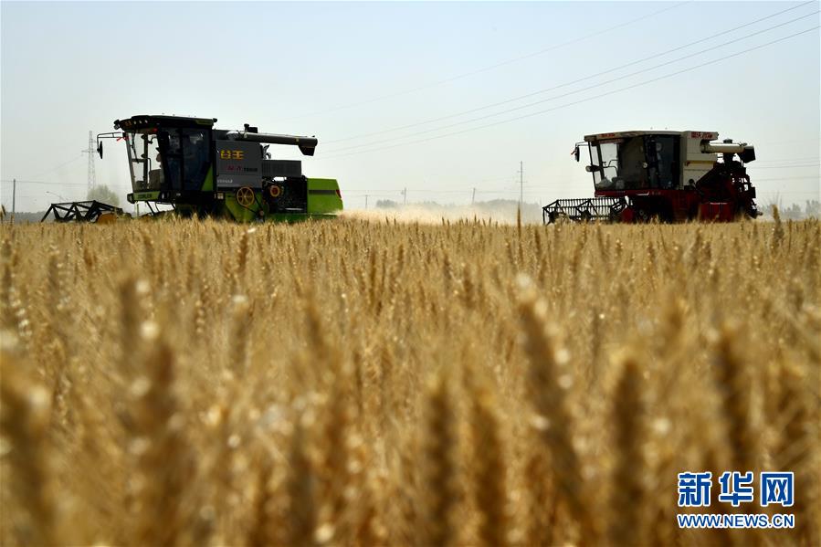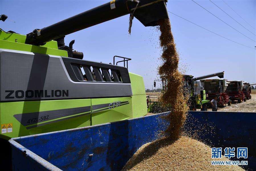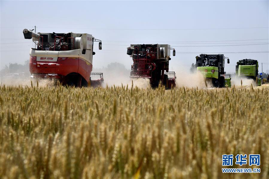 6月3日,收割機在汶上縣郭倉鎮(zhèn)的麥田里收獲小麥。目前,我國第二大小麥主產(chǎn)區(qū)山東6000多萬畝小麥進入收獲階段。農(nóng)民們搶抓有利天氣,自南向北陸續(xù)開鐮。新華社記者郭緒雷攝。