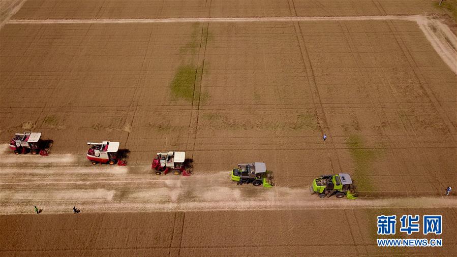 6月3日,收割機在汶上縣郭倉鎮(zhèn)的麥田里收獲小麥(無人機航拍)。目前,我國第二大小麥主產(chǎn)區(qū)山東6000多萬畝小麥進入收獲階段。農(nóng)民們搶抓有利天氣,自南向北陸續(xù)開鐮。新華社記者郭緒雷攝。