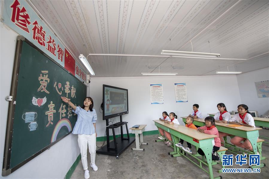 6月2日,馬武寨寄小學(xué)的英語(yǔ)老師陳燕子為學(xué)生們上開(kāi)學(xué)第一課。新華社記者楊晨光攝。