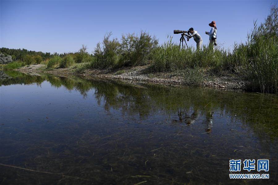 6月3日,李學(xué)明(左)和同事在黃河濕地監(jiān)測(cè)、拍攝鳥(niǎo)類(lèi)活動(dòng)。新華社記者馮開(kāi)華攝。