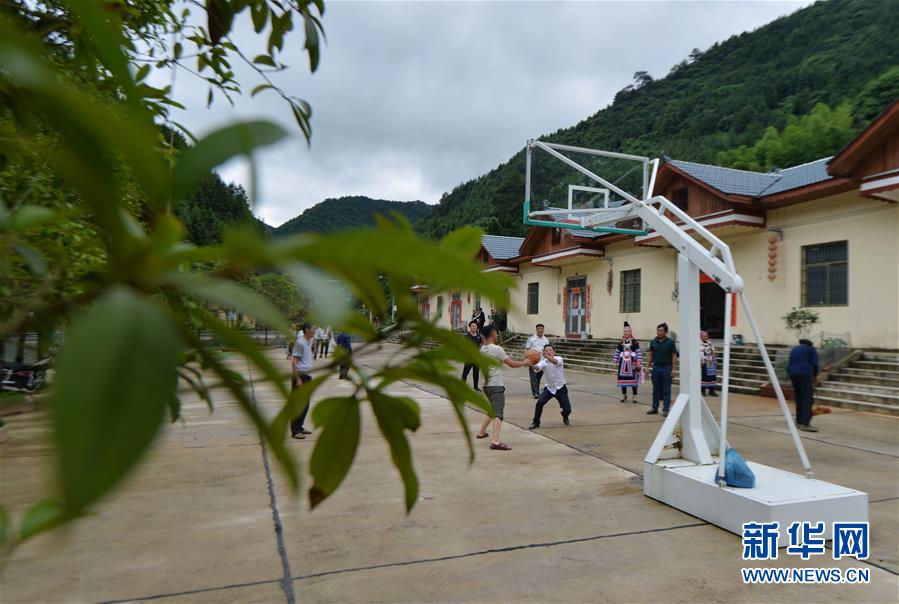 6月3日,人們?cè)谟乐菔行绿锟h兩江口村易地搬遷集中安置點(diǎn)內(nèi)打籃球。新華社記者趙眾志攝。