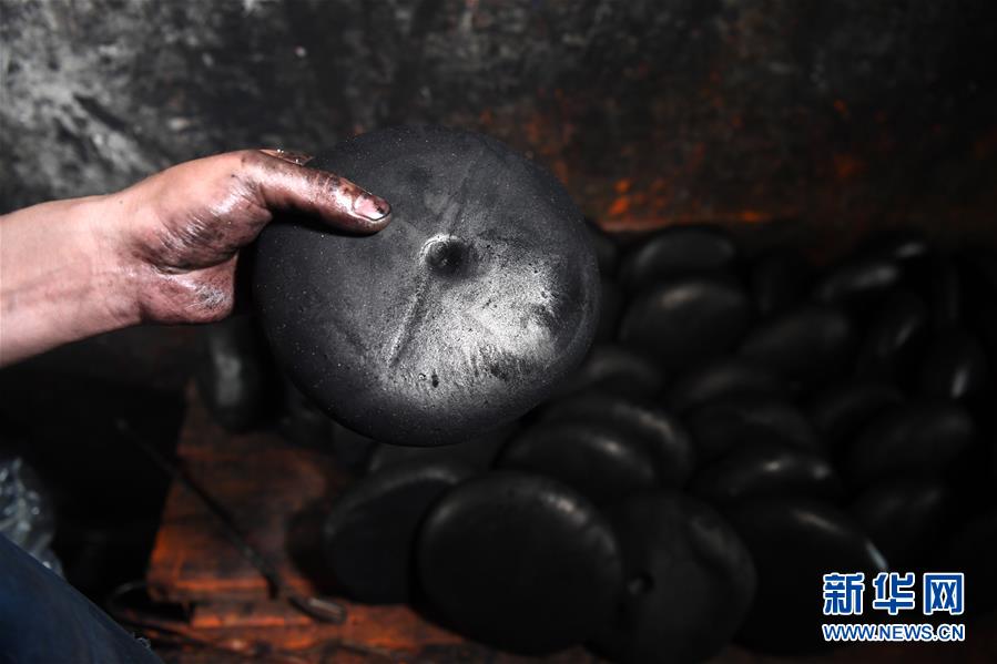 5月21日,安徽歙縣“項氏徽墨”的工人在查看墨餅。墨餅經(jīng)過加熱融化,再進行捶打,制作成墨胚。新華社記者張端攝。