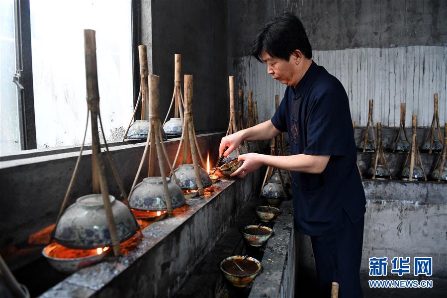 5月21日,安徽省非物質文化遺產(chǎn)徽墨代表性傳承人項德勝在進行古法煉煙。傳統(tǒng)徽墨制作工藝中,第一道工序就是煉煙。這一過程收集來的油煙是徽墨制作中最為重要的原材料。新華社記者張端攝。
