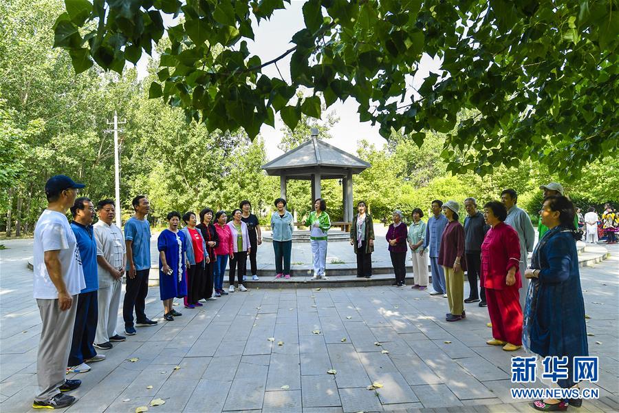 6月5日,市民在文安縣水景公園內(nèi)練習合唱。近年來,河北省文安縣將植樹造林與城市建設有機融合,探索“政府引導、企業(yè)運作、多方共贏”的市場化植樹造林新模式,大規(guī)模推進國土綠化,打造人與自然和諧共生的優(yōu)美生態(tài)環(huán)境,構筑京津雄綠色屏障。截至目前,該縣森林覆蓋率已經(jīng)達到33%,城區(qū)綠地面積達到36.48%。新華社記者李曉果攝。