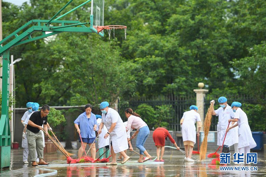 6月8日,在永州市江華瑤族自治縣白芒營鎮(zhèn)車下完全小學,工作人員在校園里清淤、沖洗地面。受近日持續(xù)強降雨影響,湖南省永州市江華瑤族自治縣發(fā)生洪澇災害。6月8日,永州市江華瑤族自治縣白芒營鎮(zhèn)車下完全小學開展清淤、消毒工作,為6月9日恢復上課做準備。新華社記者陳澤國攝