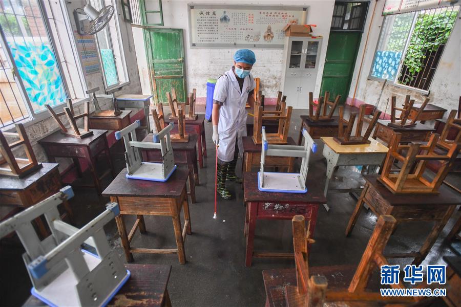 6月8日,在永州市江華瑤族自治縣白芒營鎮(zhèn)車下完全小學,白芒營中心衛(wèi)生院的工作人員在對教室進行消毒。受近日持續(xù)強降雨影響,湖南省永州市江華瑤族自治縣發(fā)生洪澇災害。6月8日,永州市江華瑤族自治縣白芒營鎮(zhèn)車下完全小學開展清淤、消毒工作,為6月9日恢復上課做準備。新華社記者陳澤國攝