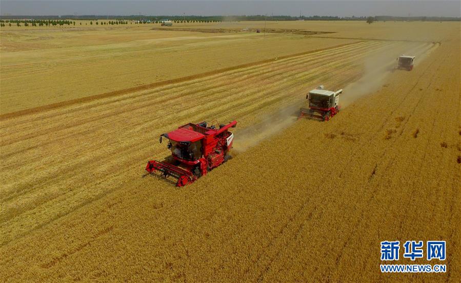 6月8日,聯(lián)合收割機在河北省南和縣閆里鄉(xiāng)閆里村麥田進行夏收作業(yè)(無人機照片)?!叭摹逼陂g,河北省預計組織和調(diào)度小麥聯(lián)合收割機、拖拉機、夏玉米播種機等200萬臺農(nóng)業(yè)機械投入作業(yè)。新華社記者朱旭東攝