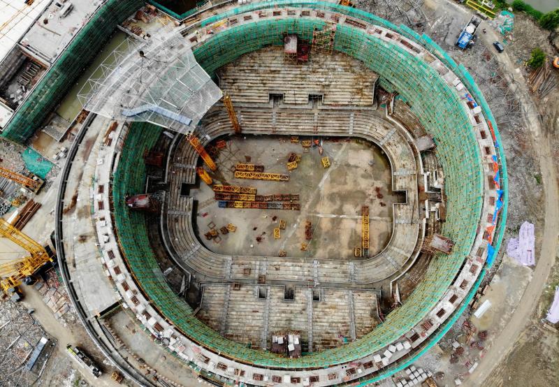 2020年6月9日,從空中俯瞰正在建設(shè)中的杭州亞運(yùn)會(huì)乒乓球館。近日,位于杭州運(yùn)河亞運(yùn)公園內(nèi)的乒乓球館主體結(jié)構(gòu)完工,開(kāi)始進(jìn)入自支撐鋼斜肋系統(tǒng)玻璃立面安裝階段。據(jù)了解,杭州亞運(yùn)會(huì)乒乓球館占地1.94萬(wàn)平方米,將建成12片標(biāo)準(zhǔn)乒乓球場(chǎng)地,并可容納5000-6500位觀眾。該乒乓球館設(shè)計(jì)靈感來(lái)源于杭州良渚文化中的“玉文化”,采用了“琮”的樣子。