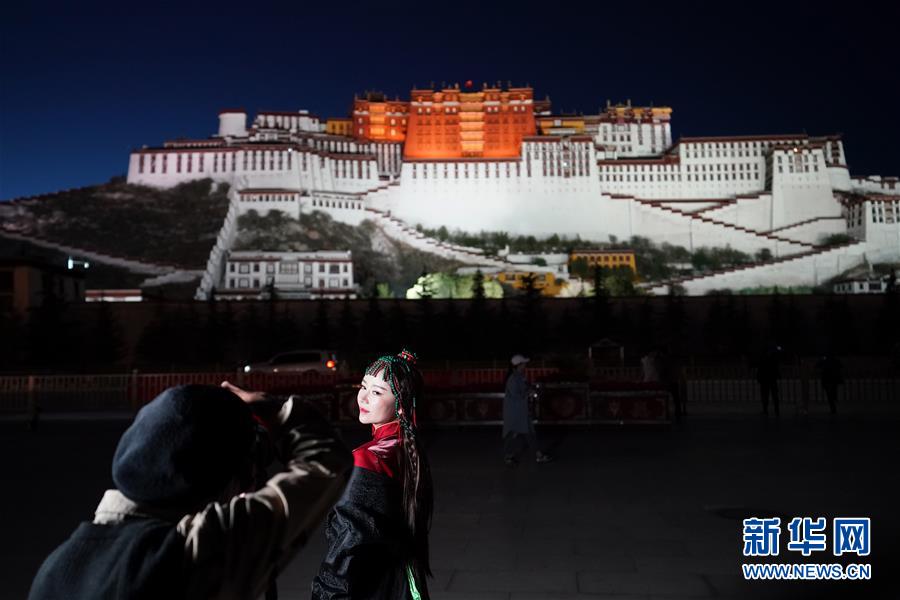 游客在布達(dá)拉宮廣場(chǎng)拍照(6月8日攝)。夜幕降臨,西藏拉薩布達(dá)拉宮燈光璀璨,夜景迷人。新華社記者詹彥攝