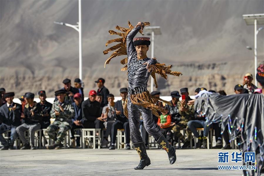 在熱斯喀木村,新疆塔什庫(kù)爾干塔吉克自治縣文工團(tuán)演員為村民表演國(guó)家級(jí)非物質(zhì)文化遺產(chǎn)——塔吉克族鷹舞(6月6日攝)。新華社記者胡虎虎攝