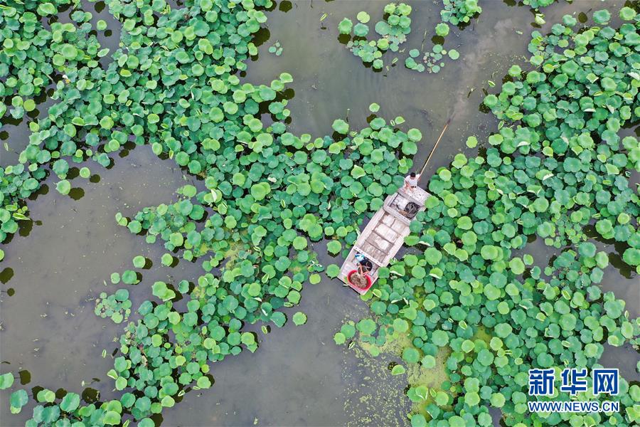 6月9日,在宿遷市宿城區(qū)中揚鎮(zhèn)一家淺水藕套養(yǎng)小龍蝦合作社,工人在給小龍蝦喂飼料(無人機照片)。