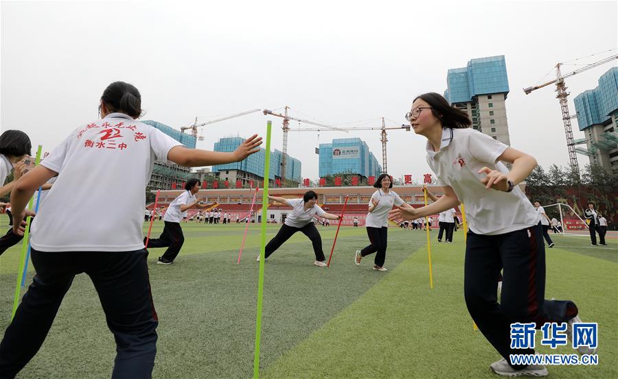 6月9日,河北省衡水市第二中學(xué)的高三學(xué)生在操場(chǎng)上參加減壓趣味游戲。2020年高考臨近,河北省衡水市第二中學(xué)組織開展多種形式的集體“減壓”活動(dòng),幫助高三學(xué)生在緊張備考之余釋放身心壓力,以輕松、樂觀、自信的心態(tài)迎接高考。新華社記者朱旭東攝