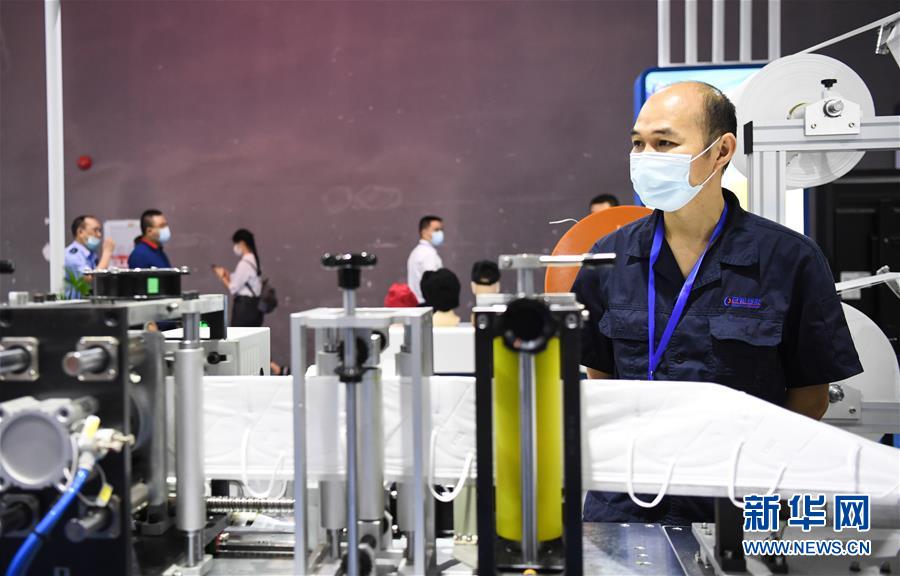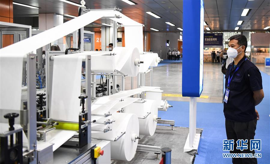 6月10日拍攝的展會(huì)上的一臺(tái)口罩生產(chǎn)設(shè)備。當(dāng)日,廣州國際防疫物資展覽會(huì)在保利世貿(mào)博覽館舉行。本次展會(huì)面積共計(jì)3.6萬平方米,設(shè)有防疫產(chǎn)品、設(shè)備、綜合服務(wù)、原輔料等4個(gè)展區(qū),參展企業(yè)約600家。新華社記者鄧華攝
