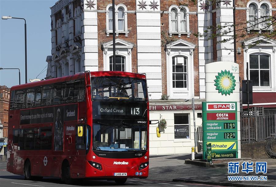 這是2020年4月21日在英國倫敦拍攝的紅色雙層巴士駛過英國石油公司加油站的資料照片。新華社記者韓巖攝