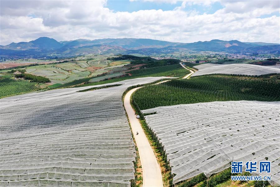這是6月11日拍攝的貴州省威寧縣一處蘋果基地(無人機照片)。近日,貴州省威寧彝族回族苗族自治縣的農(nóng)民搶抓農(nóng)時,對蘋果園進行疏果、除草等田間管理,呈現(xiàn)出一派夏管農(nóng)忙景象。威寧縣蘋果種植面積50余萬畝,蘋果產(chǎn)業(yè)已逐步成為當(dāng)?shù)剞r(nóng)民增收致富的主導(dǎo)產(chǎn)業(yè)之一。新華社記者楊文斌攝。