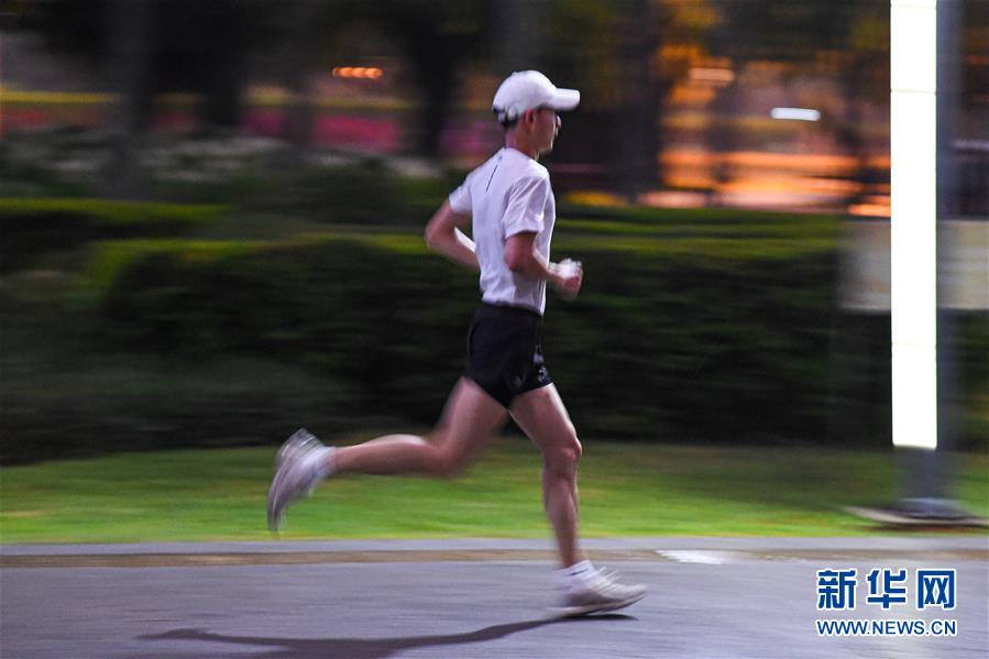 一位市民在??谌f(wàn)綠園夜跑(5月28日拍攝)。近年來(lái),夜跑成為越來(lái)越多都市人熱衷的健身方式之一。在海南???,每當(dāng)夜幕降臨,“夜跑族”來(lái)到??谌f(wàn)綠園、世紀(jì)公園等夜跑場(chǎng)所跑步,用一身酣暢淋漓的汗水?dāng)[脫白天工作中的壓力,享受跑步帶來(lái)的歡愉。新華社記者 蒲曉旭 攝