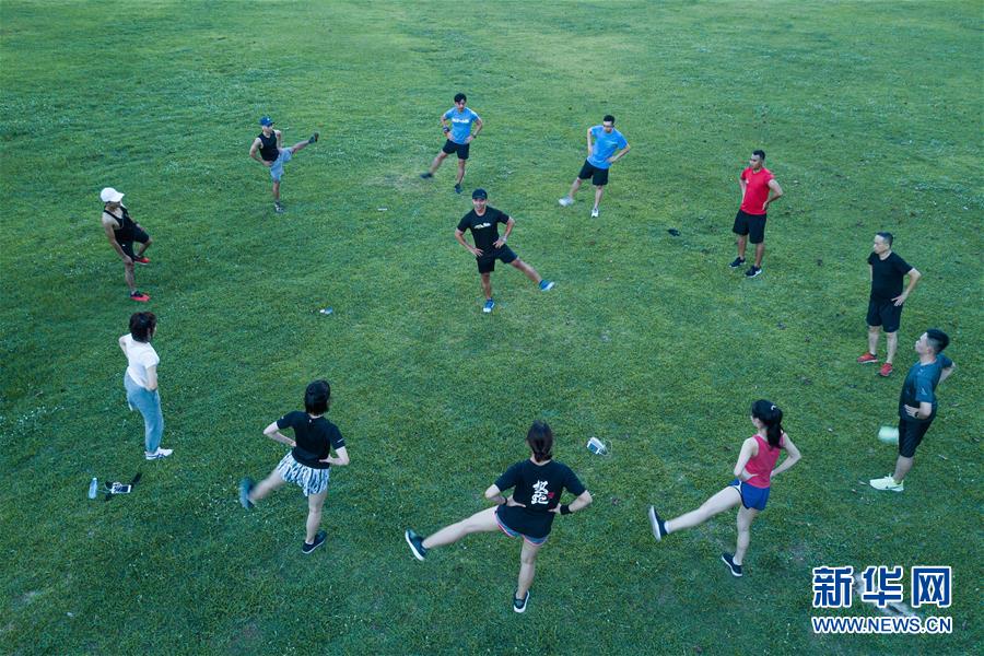 6月11日傍晚,在??谌f綠園,市民在夜跑前做熱身運動(無人機拍攝)。近年來,夜跑成為越來越多都市人熱衷的健身方式之一。在海南???,每當夜幕降臨,“夜跑族”來到??谌f綠園、世紀公園等夜跑場所跑步,用一身酣暢淋漓的汗水擺脫白天工作中的壓力,享受跑步帶來的歡愉。新華社記者 蒲曉旭 攝