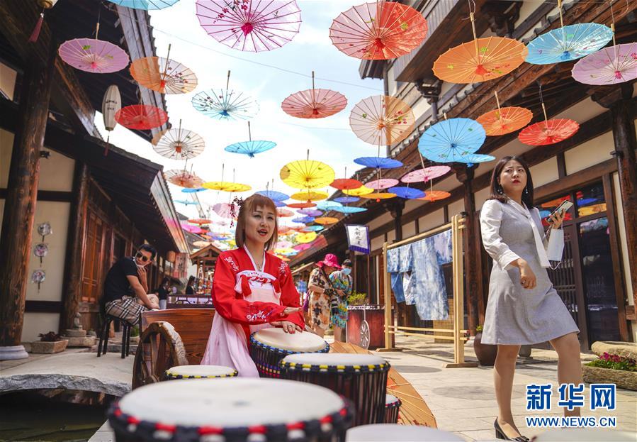 6月13日,在長春市世茂蓮花山小鎮(zhèn)寬厚里商街,一名古裝愛好者演奏手鼓。當日是“文化和自然遺產(chǎn)日”。吉林長春首屆蓮花山消夏生活節(jié)在世茂蓮花山小鎮(zhèn)舉行。活動將非遺展示與假日消暑休閑相結(jié)合,讓游人在“古色古香”的油紙傘巷中品傳統(tǒng)文化魅力,享夏日休閑愜意。新華社記者許暢攝。