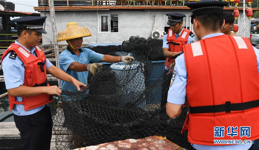 6月13日,海南省公安廳海岸警察總隊(籌備組)陵水支隊民警幫助轄區(qū)內(nèi)漁民整理漁網(wǎng)。當日,海南省氣象局于16時30分繼續(xù)發(fā)布臺風四級預(yù)警。今年第2號臺風“鸚鵡”(熱帶風暴級)預(yù)計于14日在廣東沿海登陸。新華社記者楊冠宇攝。