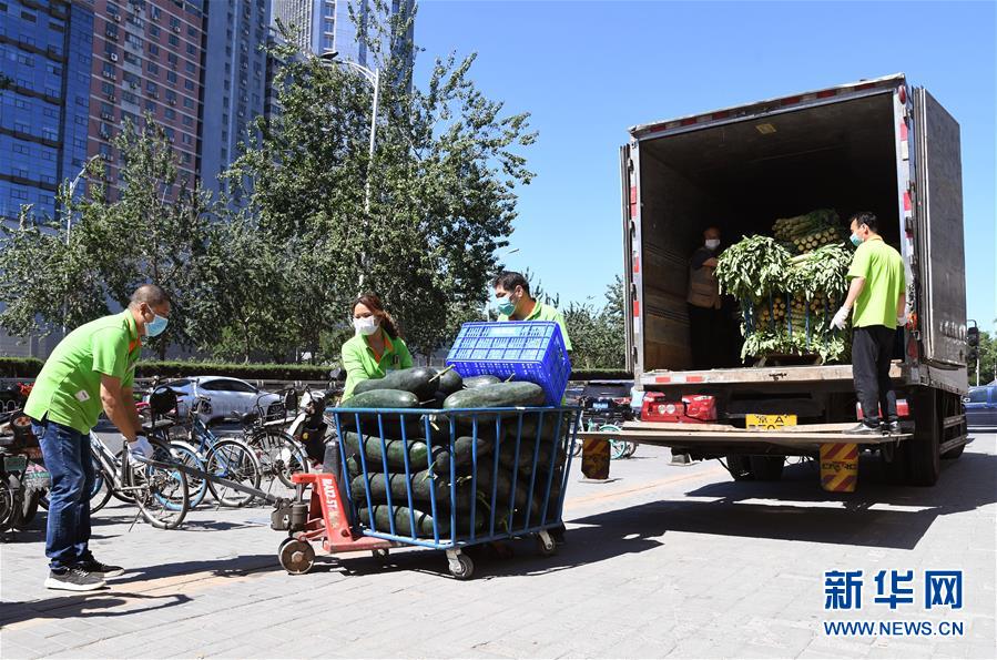 6月14日,在北京市海淀區(qū)的超市發(fā)雙榆樹(shù)店門(mén)口,工作人員在搬運(yùn)蔬菜。 新華社記者 任超 攝