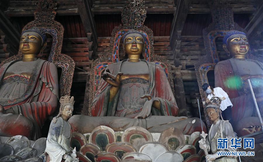 6月8日,工作人員對奉國寺的彩繪泥塑進(jìn)行保護(hù)修復(fù)。新華社記者 姚劍鋒 攝