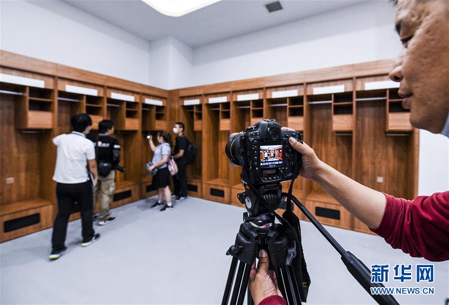 6月16日,在新疆烏魯木齊奧林匹克體育中心綜合體育館內(nèi),媒體從業(yè)者在拍攝運(yùn)動(dòng)員更衣室。新華社記者 王菲 攝