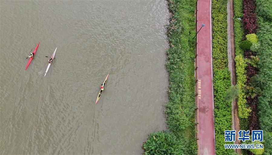6月15日,劃艇運(yùn)動(dòng)員在茅洲河上訓(xùn)練(無(wú)人機(jī)照片)。新華社記者 鄧華 攝