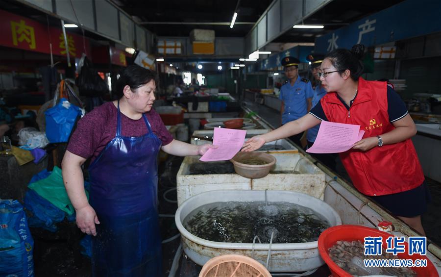 6月17日,黨員志愿者(右一)在東林鎮(zhèn)農(nóng)貿(mào)市場給經(jīng)營戶發(fā)放野生動(dòng)物保護(hù)及禁食倡議書。新華社記者 徐昱 攝