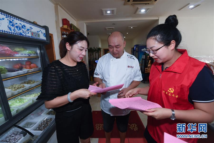 6月17日,黨員志愿者(右)在東林鎮(zhèn)一家農(nóng)家樂內(nèi)給經(jīng)營戶發(fā)放野生動(dòng)物保護(hù)及禁食倡議書。新華社記者 徐昱 攝