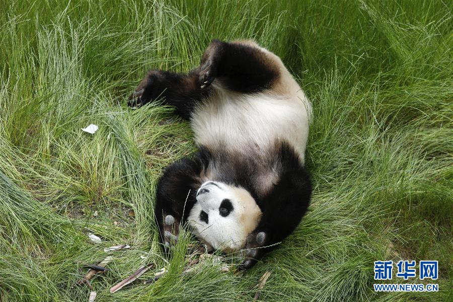 在位于四川省阿壩藏族羌族自治州的九寨溝大熊貓園,大熊貓“海?!痹诖驖L(6月19日攝)。新華社記者沈伯韓攝