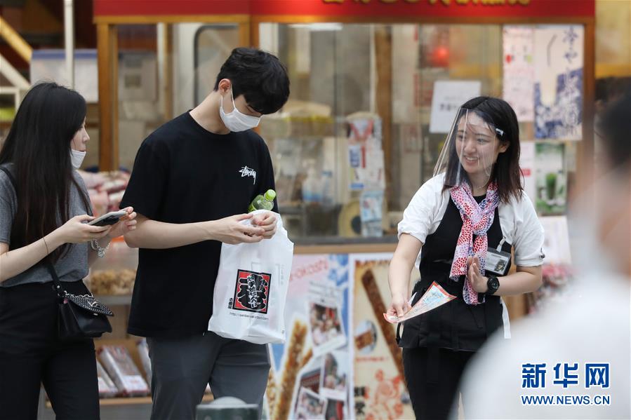 6月21日,在日本東京,一名人力車(chē)工作人員(右)向游客發(fā)傳單。當(dāng)日是周末,日本政府繼解除全國(guó)各地緊急狀態(tài)之后,19日起解除避免跨縣移動(dòng)的要求,全國(guó)范圍內(nèi)允許自由移動(dòng),進(jìn)一步松綁社會(huì)經(jīng)濟(jì)活動(dòng)。東京一些觀光景區(qū)內(nèi)的店鋪逐漸恢復(fù)營(yíng)業(yè),人流量有所回升。新華社記者杜瀟逸攝