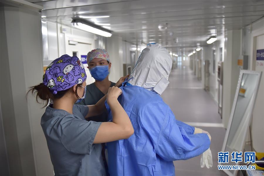 6月19日,在北京地壇醫(yī)院隔離病房外,兩位護(hù)士在幫同事穿防護(hù)服。新華社記者彭子洋攝