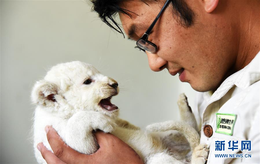 6月14日,濟(jì)南野生動(dòng)物世界飼養(yǎng)員何樹(shù)寶與一只滿月小白獅在一起。新華社記者王凱攝