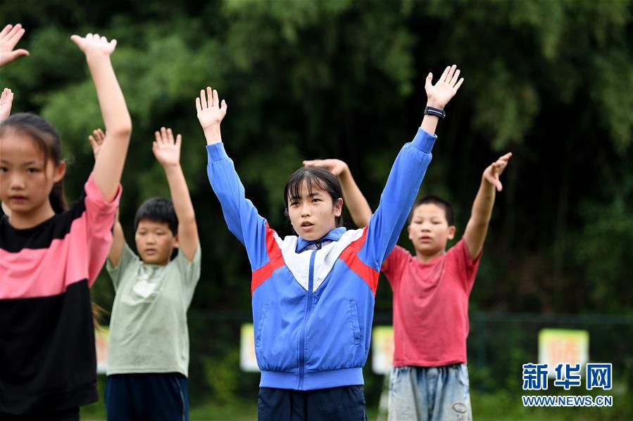 6月19日,在金寨縣三合實驗學校,蔡齊艷和同學一起上體育課。新華社記者張端攝