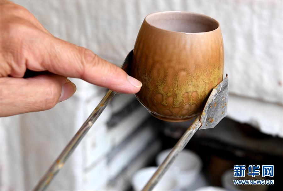 在河南省鞏義市站街鎮(zhèn)小黃冶村的工作室里,游光明在研究釉色的流動性(6月19日攝)。新華社記者李安攝
