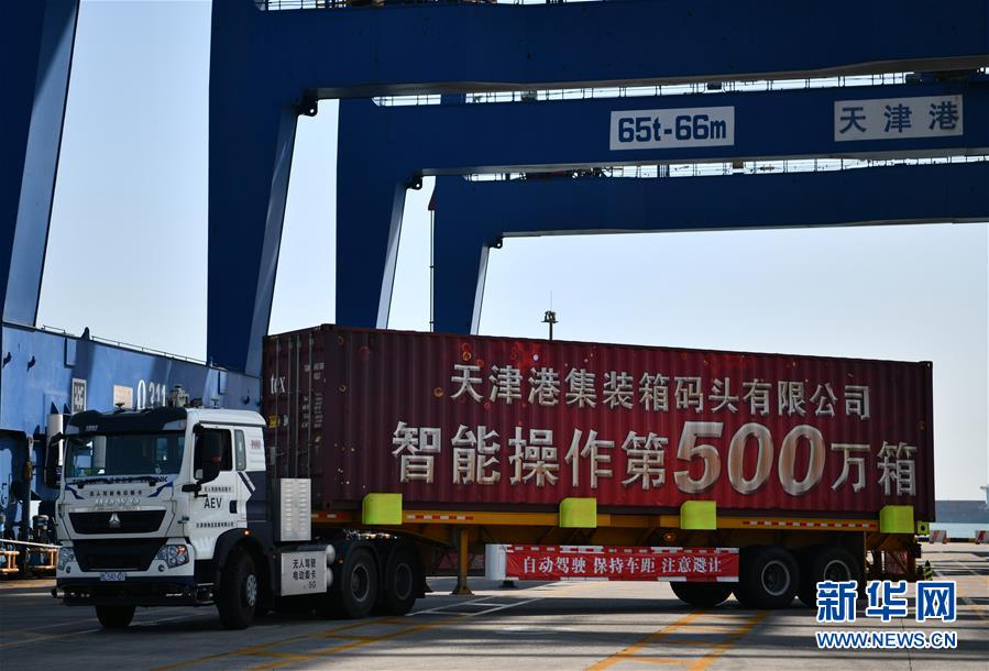 在天津港集裝箱碼頭有限公司北區(qū)智能碼頭自動(dòng)化堆場,裝載著集裝箱的無人駕駛電動(dòng)集裝箱卡車向碼頭駛?cè)ィ?019年9月26日攝)。新華社記者李然攝